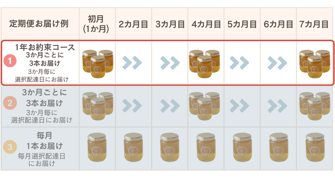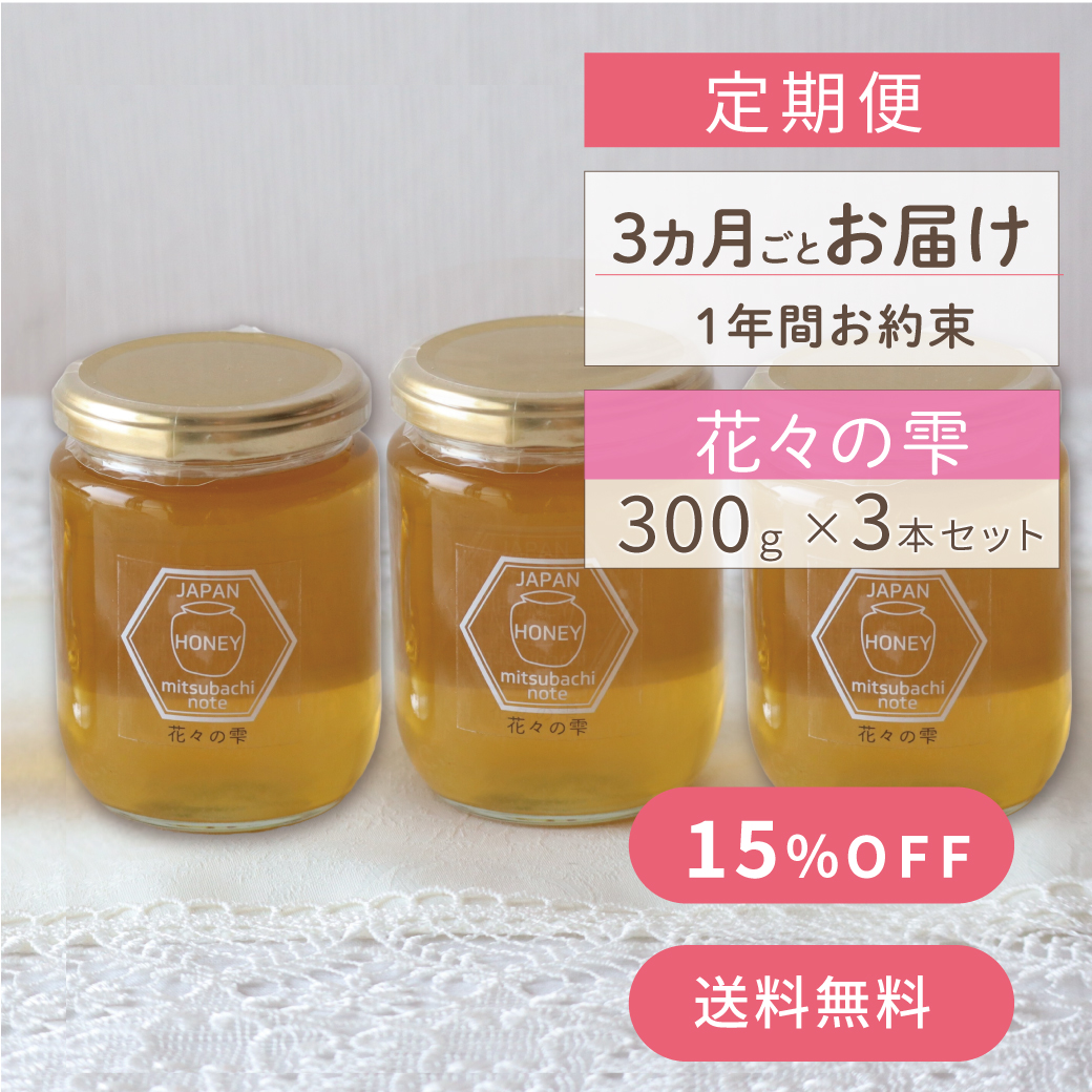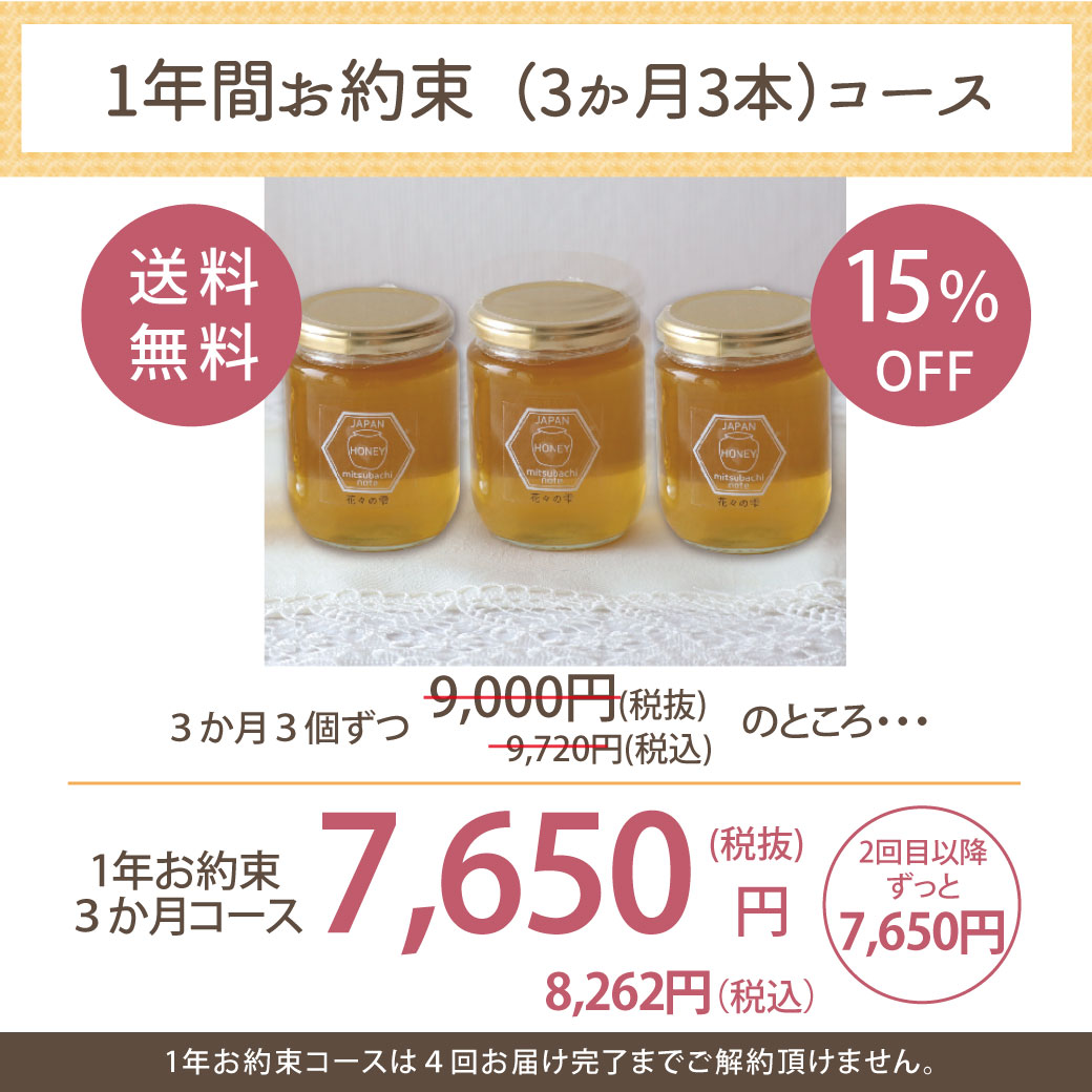 3か月ごとに、3本ハチミツを一年間お届けします。
