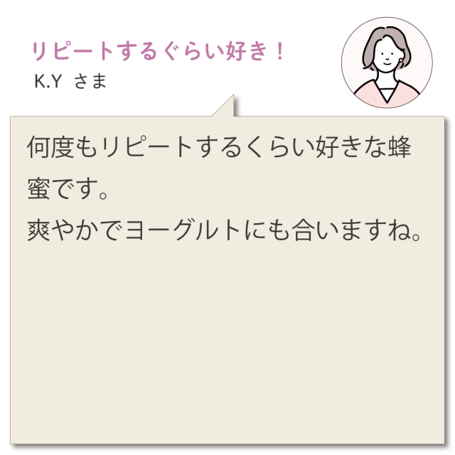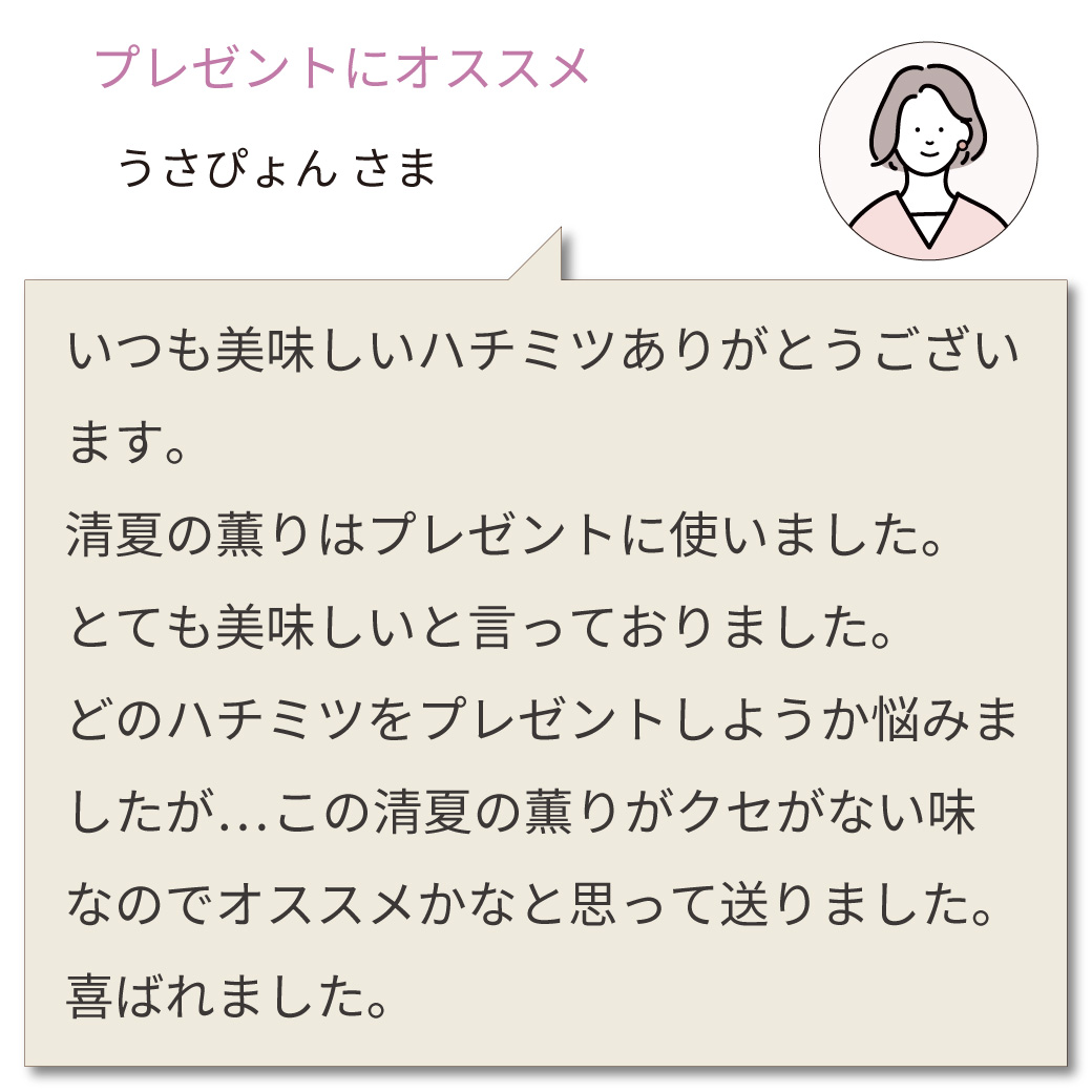 ミツバチたちがじっくり熟成させた採蜜したての『清夏の薫り』を、ぜひ召し上がってくださいね。』