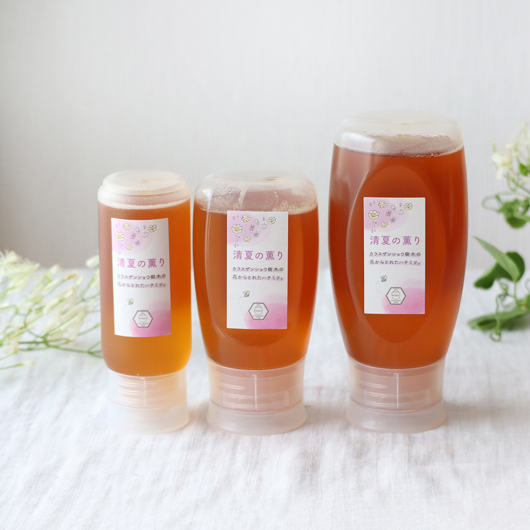 『清夏の薫り』は、夏に咲く、カラスザンショウというみかん科の樹木が咲く時期に集めてきたハチミツです。