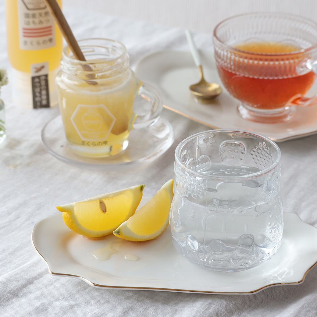 グラスにハチミツをスプーン1杯入れて、レモンをギュッ。