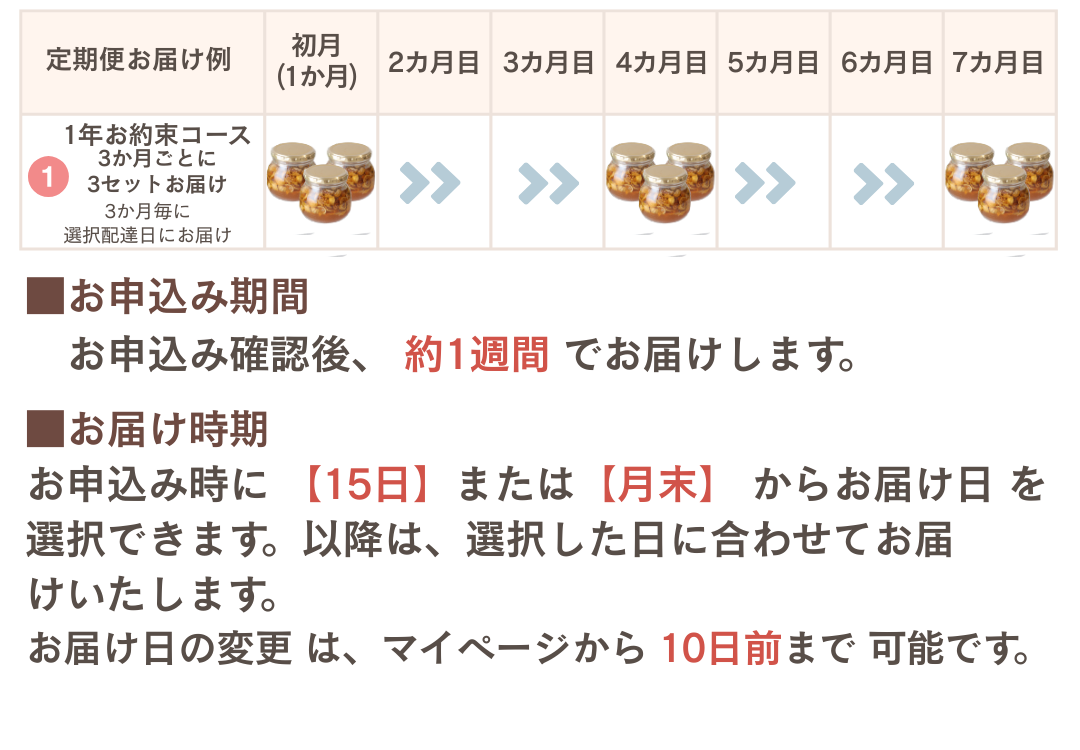 『イチジク漬けハチミツ定期便』では、定期的に、自動で決まった量をお届けさせて頂きます。