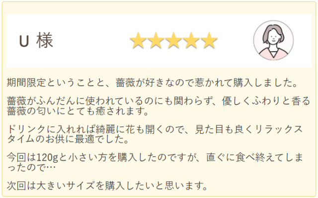 思っていた以上に花びらが入っており、香りも口の中に広がってすぐなくなってしまい、楽しみにしておりました。大容量とても嬉しいです。私は紅茶やスコーンにたっぷり合わせるのがお気に入りです。 |