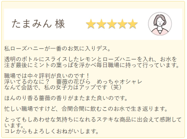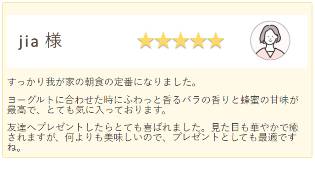 ヨーグルトに合わせた時にふわっと香るバラの香りと蜂蜜の甘味が最高で、とても気に入っております。