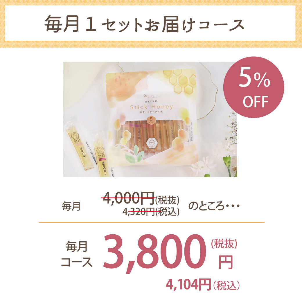 『スティックハチミツ定期便』では、初回20%OFFでのお届け+2回目以降5%OFFの割引価格にてお届けをさせて頂きます。