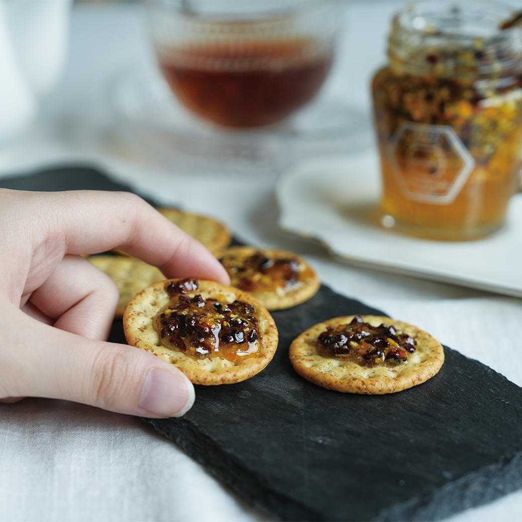 クラッカーの素朴さと『みかんカカオニブハニー』のほろ苦い甘みで、リッチな焼き菓子風に。