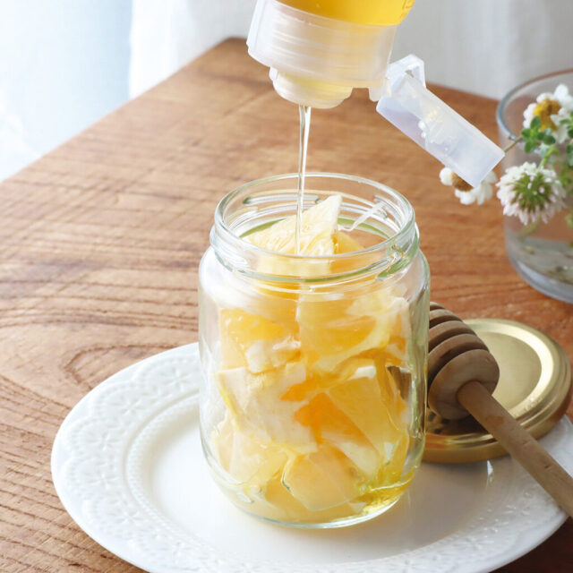 レモンをスライスしてハチミツにかけてしばらく置くと、「ハチミツ・レモン」に。