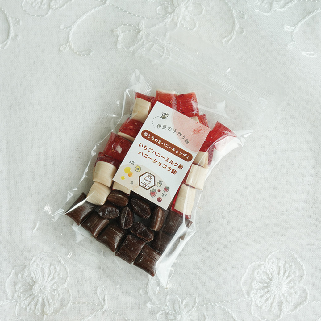 伊豆産のドライイチゴをハチミツ飴に練り込んだキュートな『いちごハニーミルク飴』と、優しいショコラの味わいが楽しめる『ハニーショコラ飴』を、一袋でお楽しみいただけます。