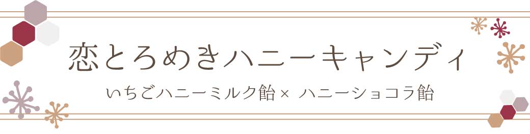 いちごハニーミルク飴:グラニュー糖(国内製造)、水飴、国産はちみつ、上白糖 ハニーショコラハチミツ飴:グラニュー糖(国内製造)、水飴、国産はちみつ、上白糖、生クリーム、練乳、バター、ココアパウダー |
