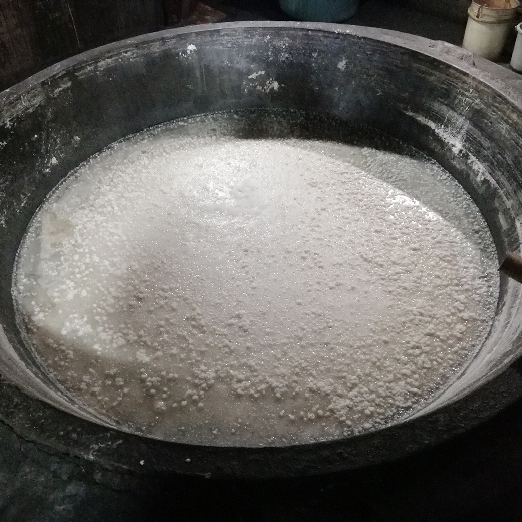 海水を大きな釜でじっくり時間をかけて煮詰め、塩を結晶化させます。