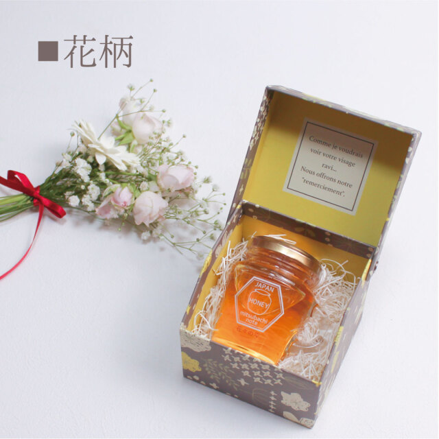 ちょっとしたプレゼントに、落ち着いたお花柄のギフトボックスにハチミツを入れて贈るもの素敵ですよね。