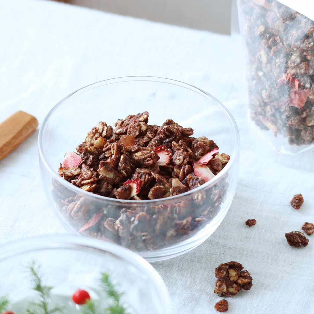 『クラシックショコラ苺グラノーラ』は噛んだ瞬間に広がるカカオニブとココアのビターな味わいと、ドライ苺の甘酸っぱい味と香りが広がる、大人の贅沢グラノーラ。