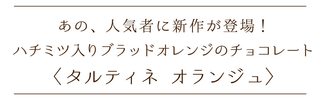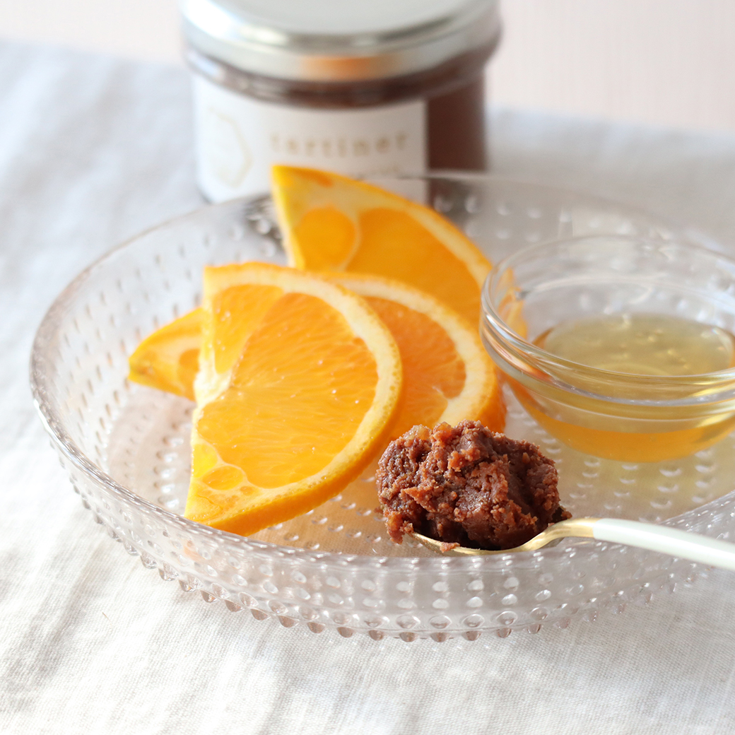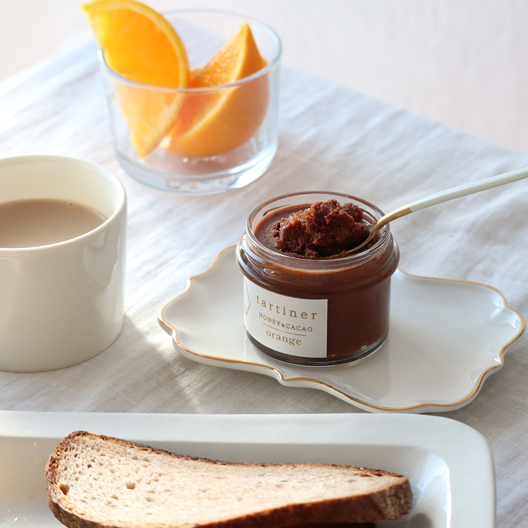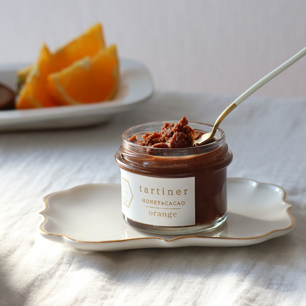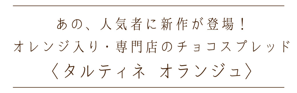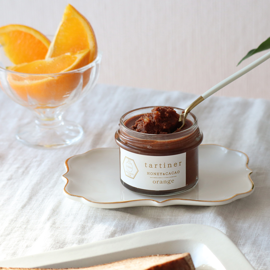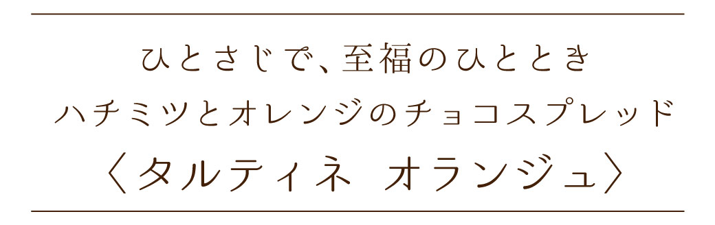 タルティネの濃厚なコクはそのままに、国産ブラッドオレンジのコンフィチュールが入った、大人ためのオレンジチョコスプレッド。