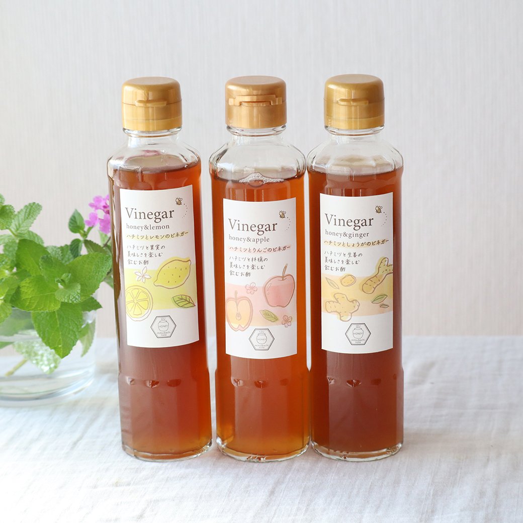 ハチミツ入り玄米黒酢 ハチミツとレモンのビネガー ハチミツとしょうがのビネガー ハチミツとりんごのビネガー |