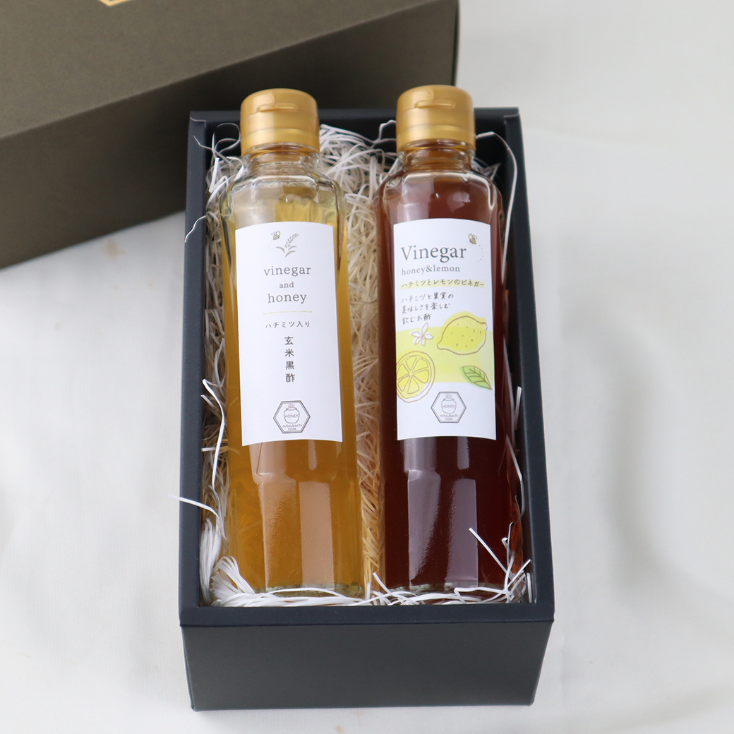 『ハチミツ入り玄米黒酢と果実のビネガー』をギフトボックスにお入れした詰合せを3種類ご用意しました。