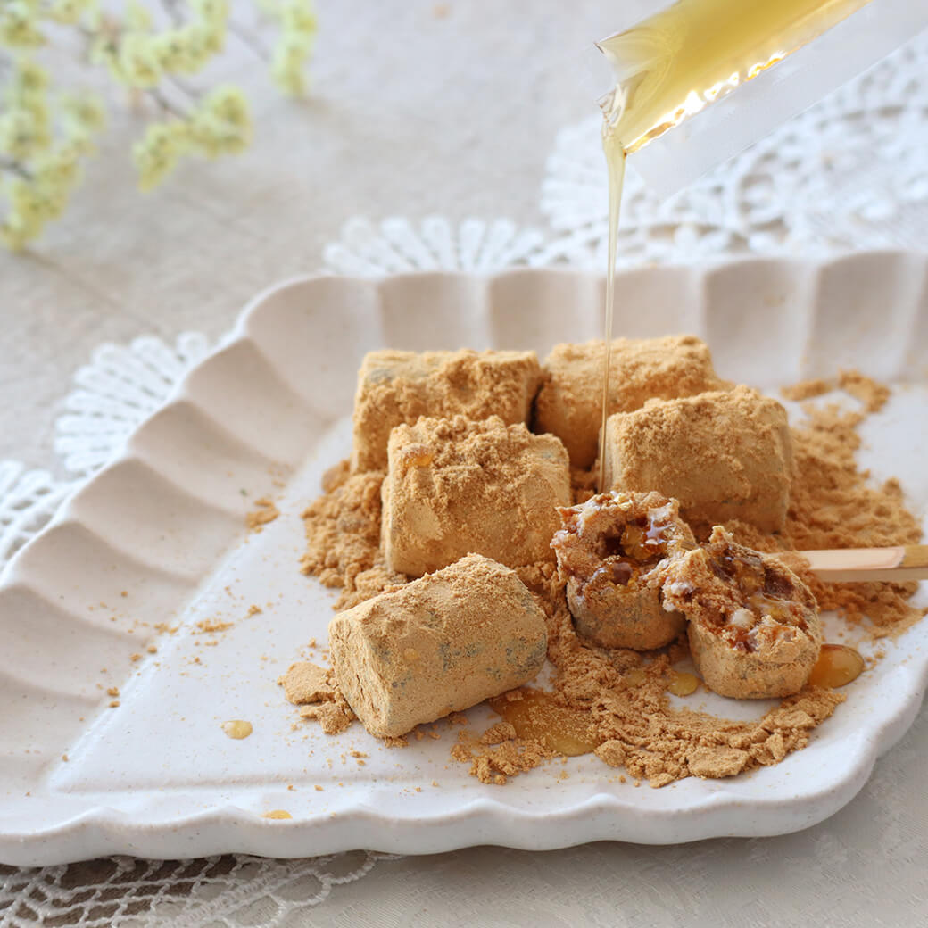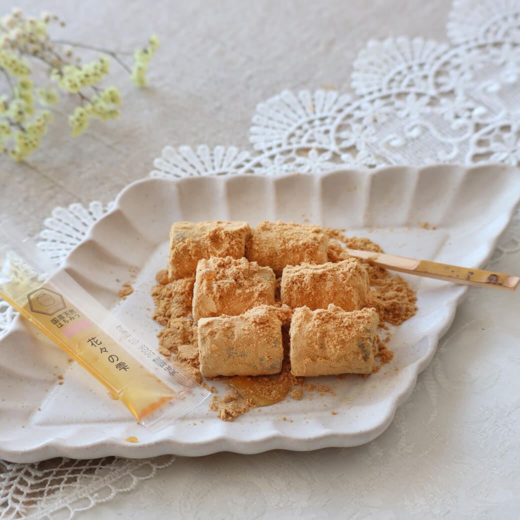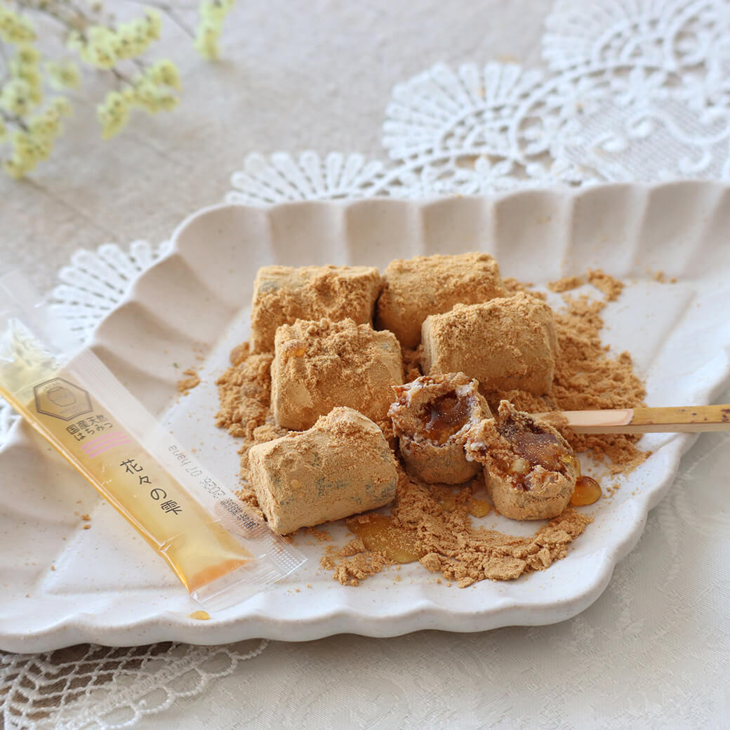 口の中でとろけるハチミツの上品な甘さと、ほのかな花の香りがきな粉と合わさり、