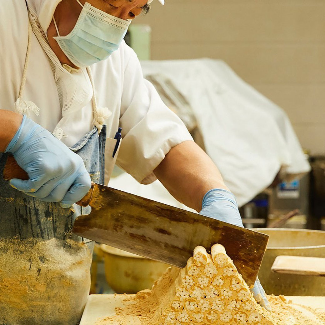 最後に大きな包丁でカットされ、ようやく五家宝が完成します。