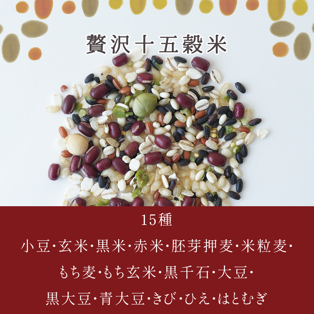 贅沢十五穀米:小豆・玄米・黒米・赤米・胚芽押麦・米粒麦・もち麦・もち玄米・黒千石・大豆・黒大豆・青大豆・きび・ひえ・はとむぎ 雑穀米:玄米・黒米・赤米・緑米・米粒麦・胚芽押麦・もち米・もち玄米・黒千石・きび・ひえ・はとむぎ |