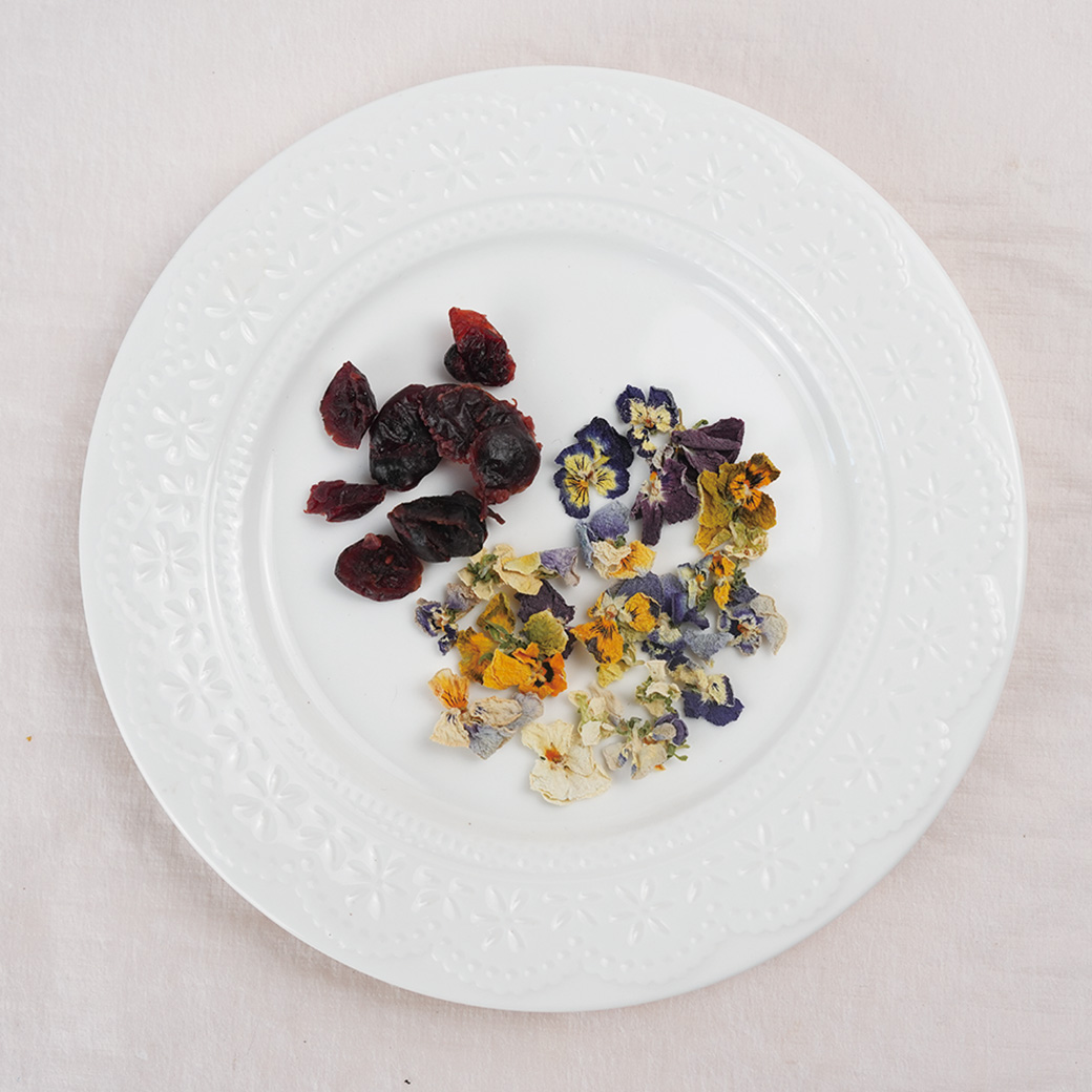 ビオラの可憐な姿は見ているだけで心を和ませ、クランベリーの爽やかな酸味とやさしい甘さが口いっぱいに広がります。
