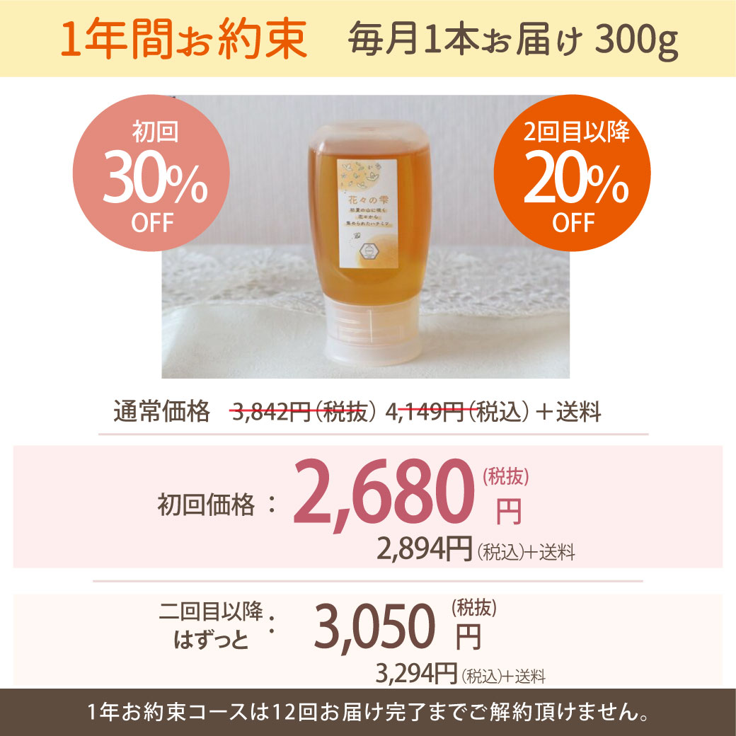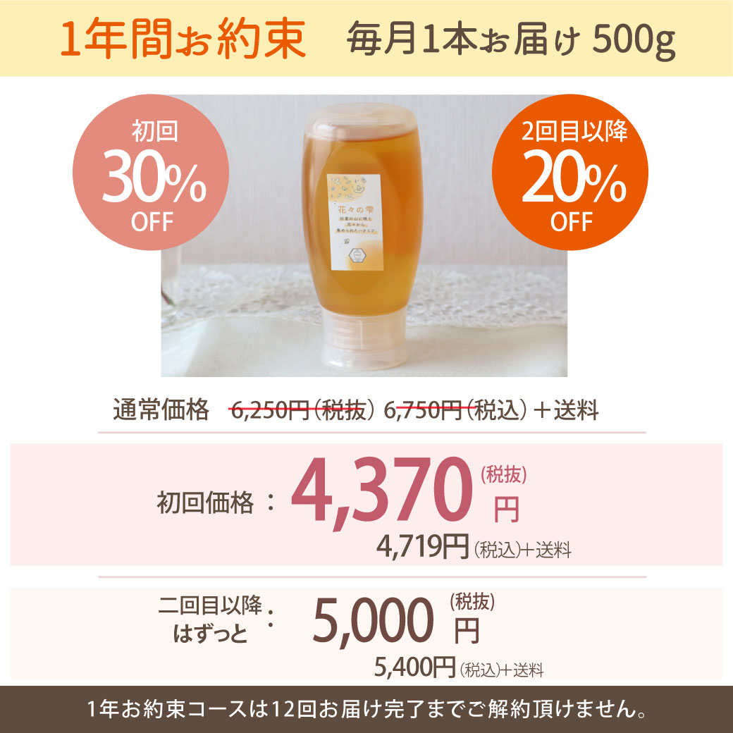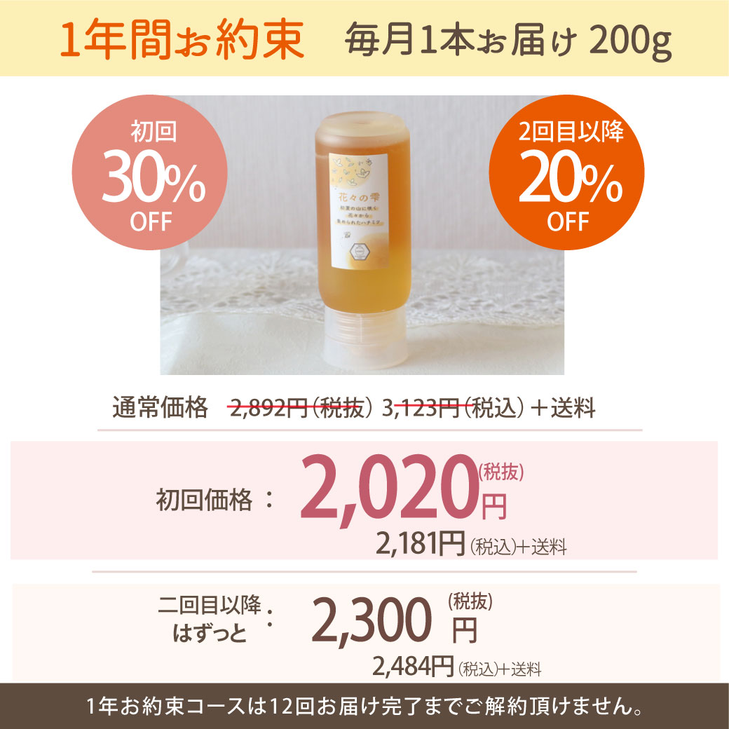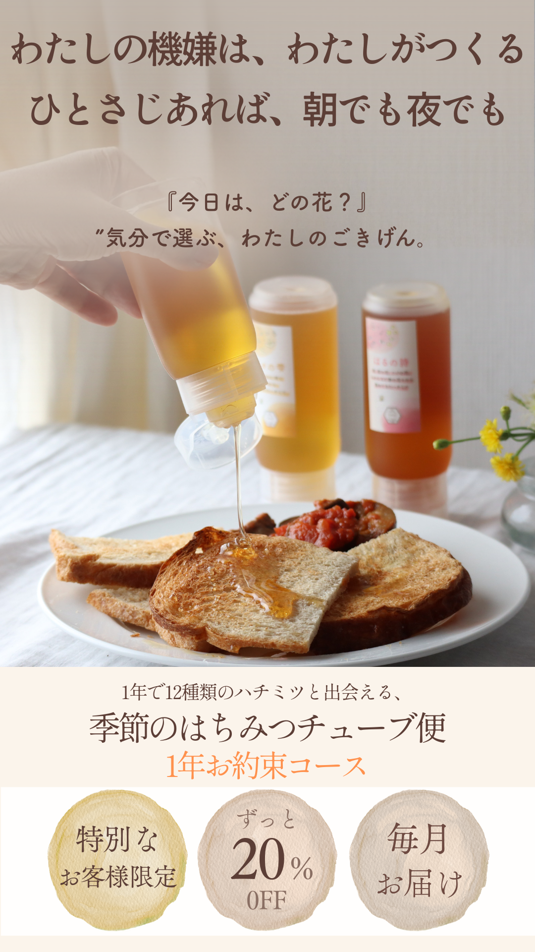 今回、特別なお客様限定『1年お約束【毎月お届け】季節のはちみつチューブ便』をご用意いたしました。