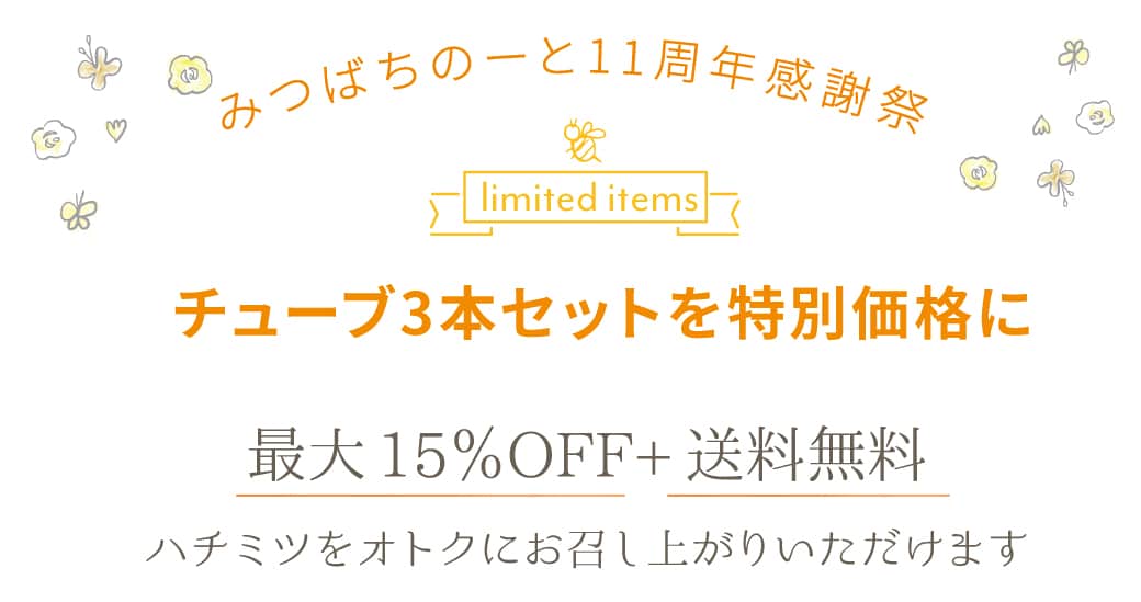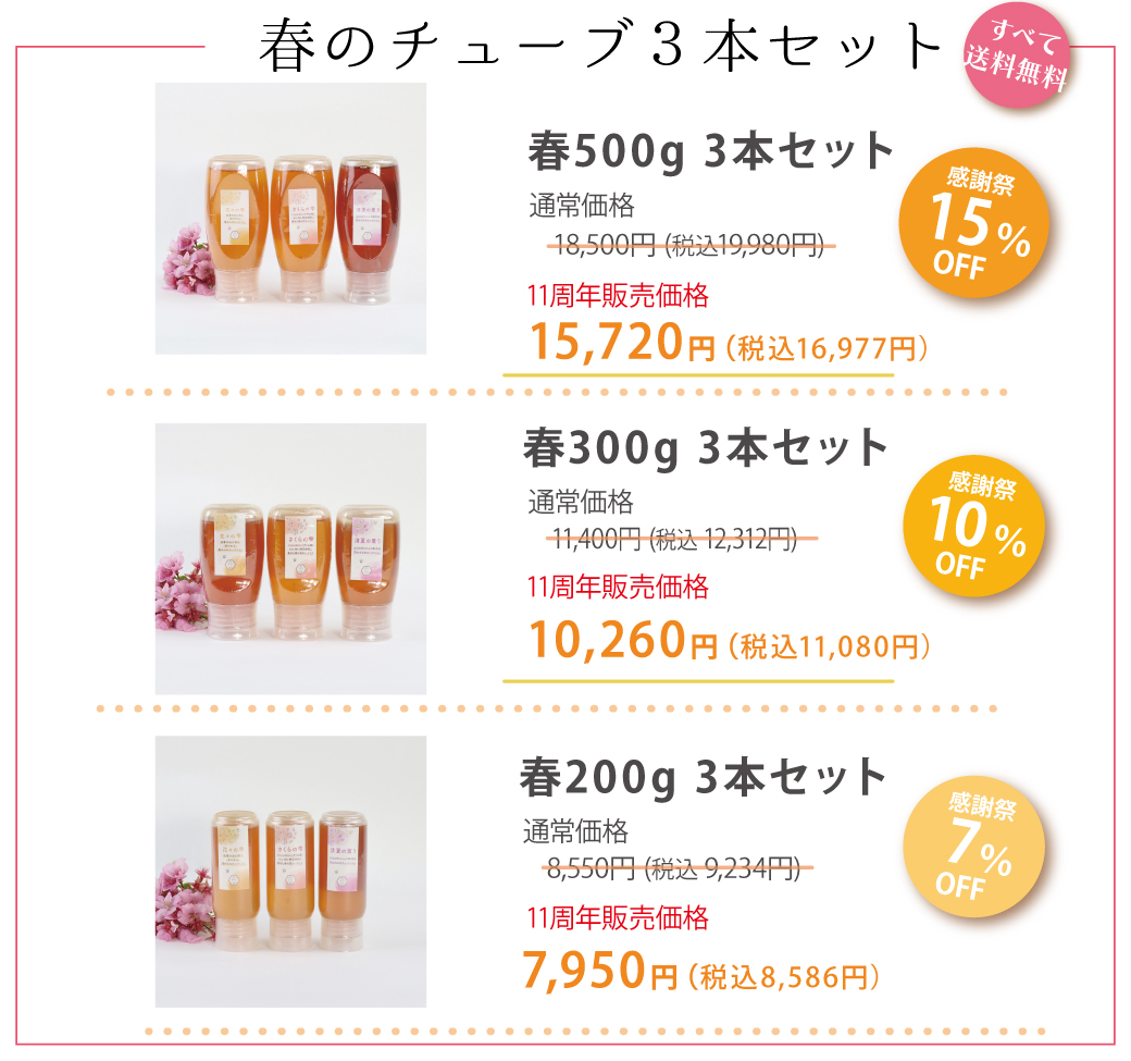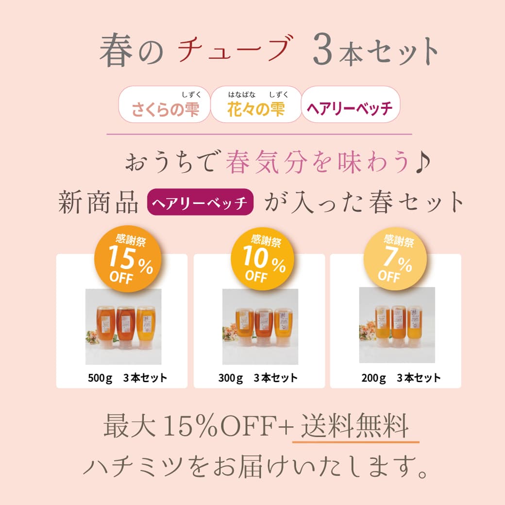 感謝の気持ちを込めて、『春のチューブハチミツ3本セット』を最大15%OFFにてご提供させていいただきます。