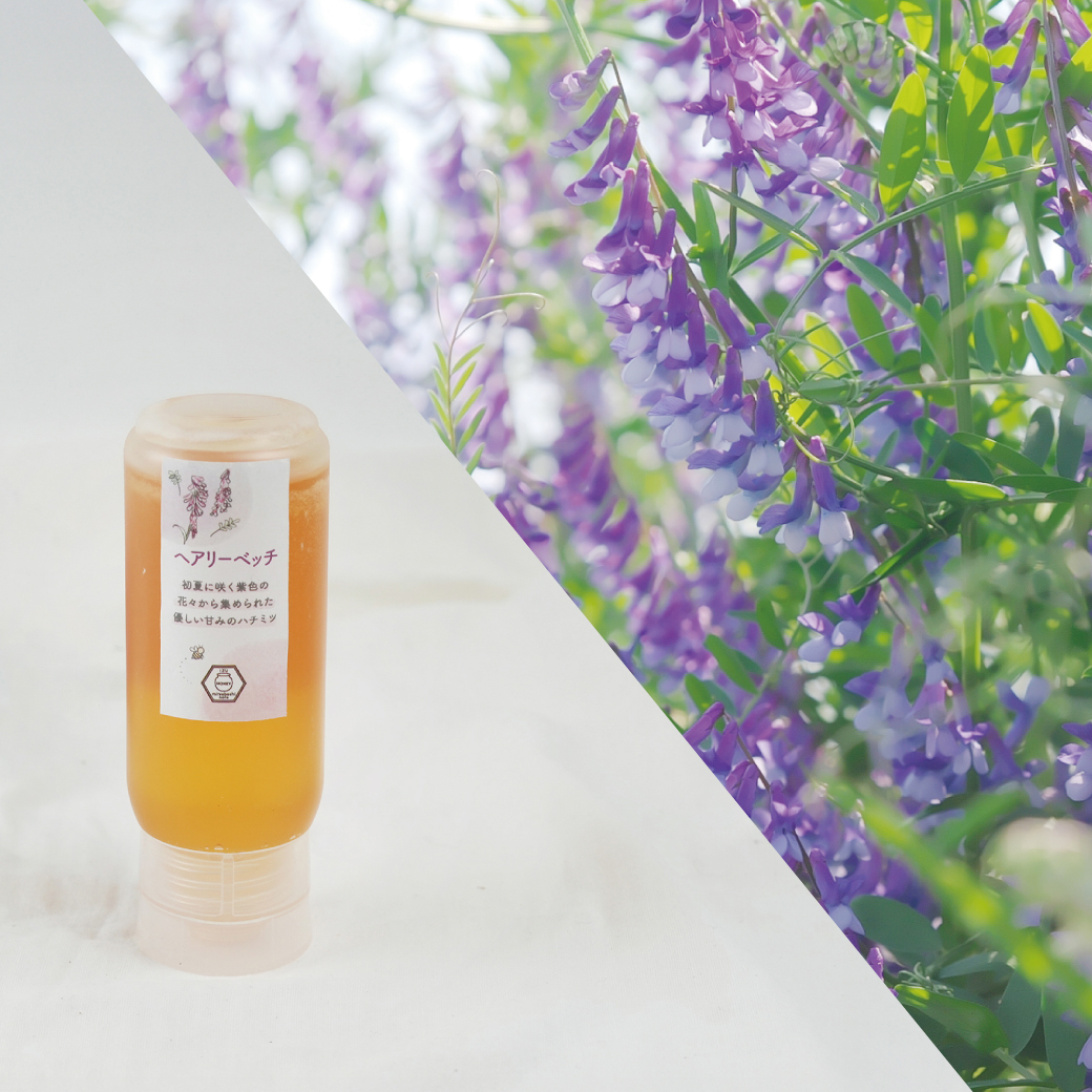 『ヘアリーベッチ』は、春の野原を紫に染めるマメ科の植物から採れた、希少な国産はちみつです。