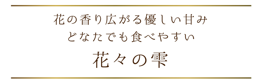 花々の雫 熱量:328kcal、蛋白質:0.2g、脂質:0.1g、炭水化物:81.8g、食塩相当量:0.01g 清夏の薫り 熱量:328kcal、蛋白質:0.2g、脂質:0.1g、炭水化物:81.8g、食塩相当量:0.01g |