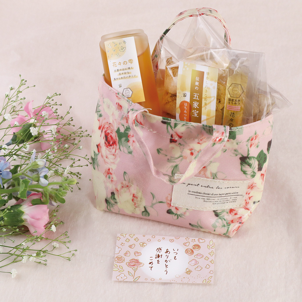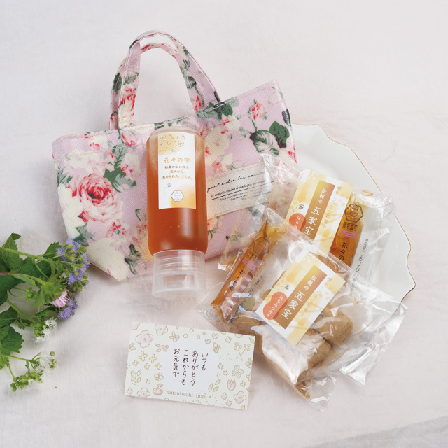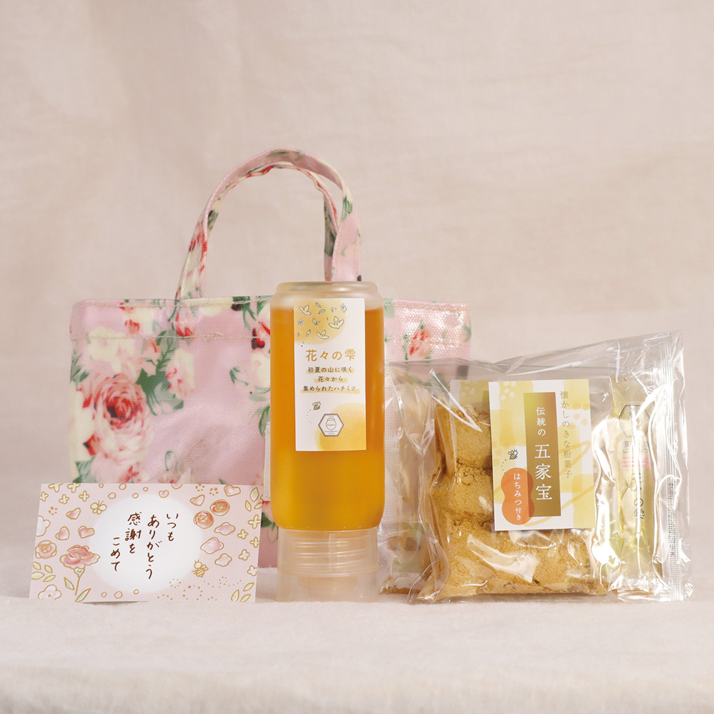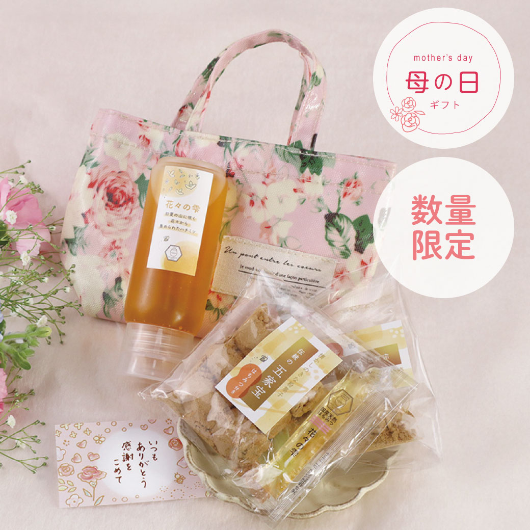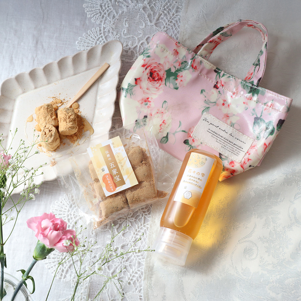 華やかな花の香りが広がる「花々の雫ハチミツ」と、当店で人気のきなこ菓子「五家宝」を、春らしい花柄のトート型ポーチにお入れしてお届けする、母の日限定の特別な贈り物です。