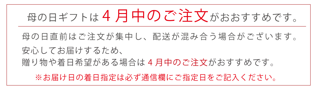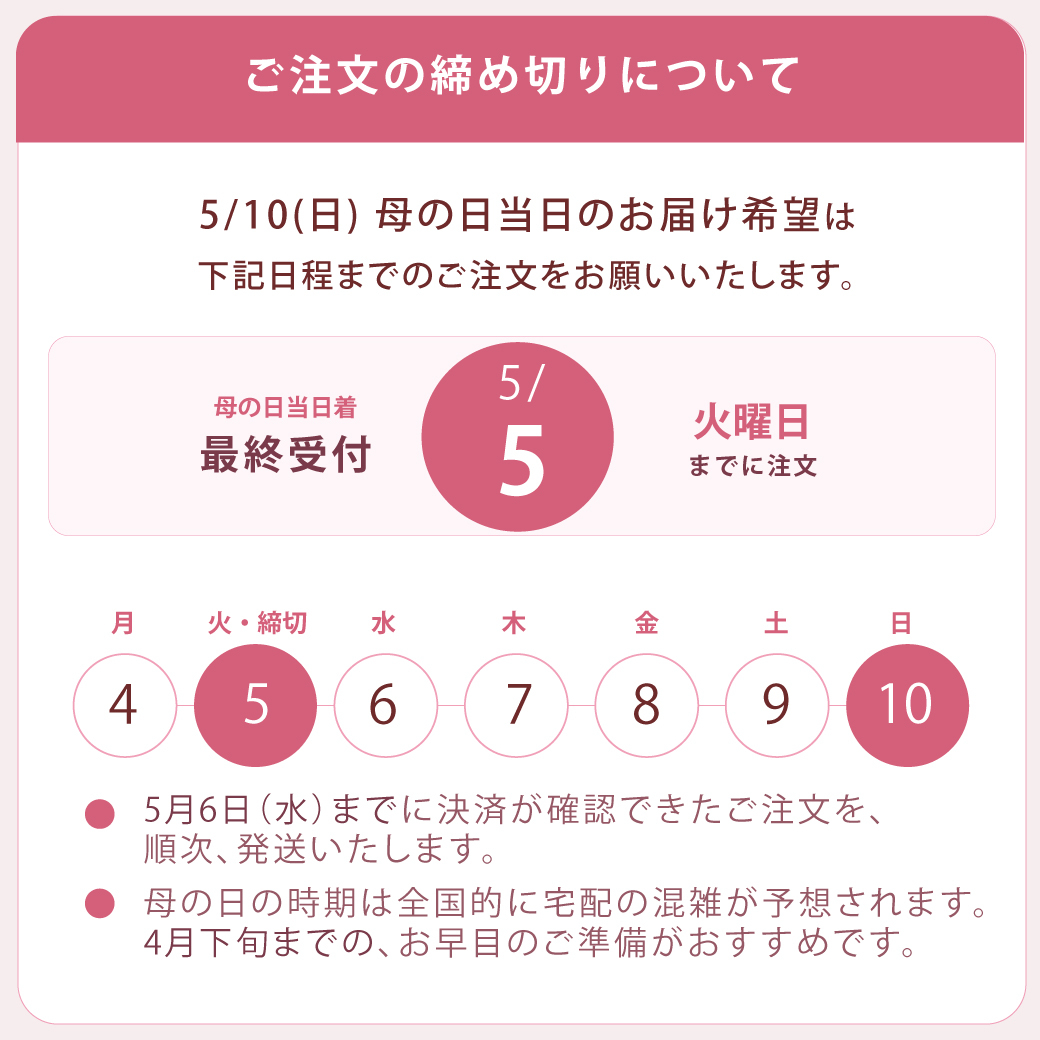※ 5月6日(水)以降のご注文は、5月10日(日)の母の日までのお届けが確約できかねます。あらかじめご了承ください。