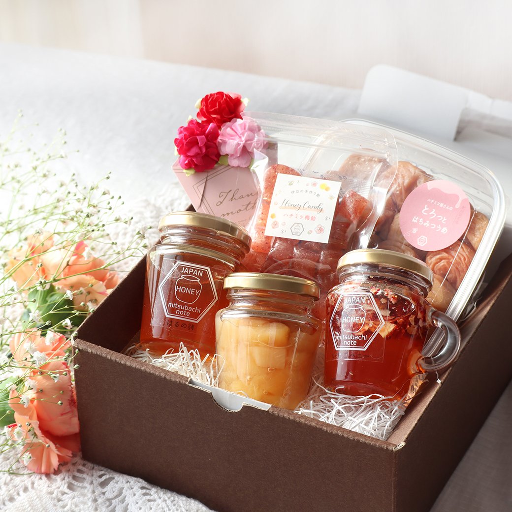 | セット内容 | とろっとはちみつうめ180g、ハチミツと桃のコンフィチュール110g、いちごハニー120g、はるの詩120g、ハチミツ梅飴60g |