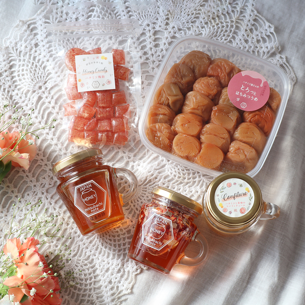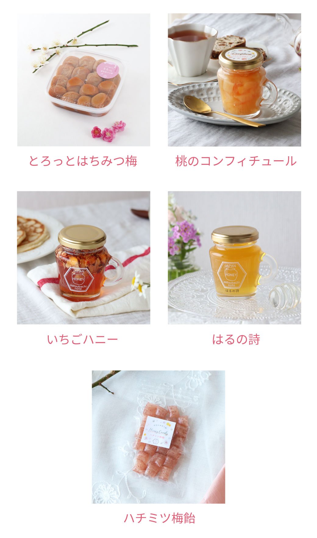 | 原材料 | とろっとはちみつうめ:梅(三重県産)、漬け原材料(塩(天日塩)、国産ハチミツ、発酵調味料、オリゴ糖)、調味料(アミノ酸等)、酸味料、甘味料(ステビア)ビタミンB1 桃のコンフィチュール:桃、はちみつ、レモン果汁 いちごハニー:国産はちみつ・イチゴ はるの詩:はちみつ(国産) ハチミツ梅飴:グラニュー糖、水飴、はちみつ(国産)、梅干(国産) |
