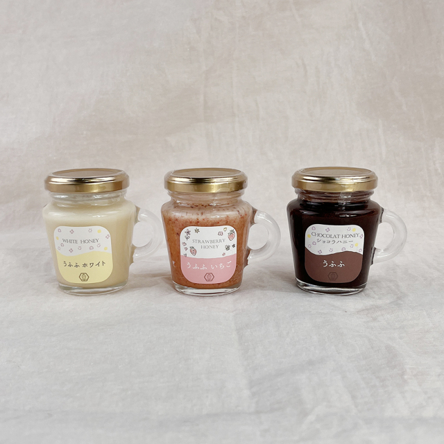 うふふホワイト:ハチミツ(国産) うふふいちご:ハチミツ(国産)、イチゴパウダー うふふショコラ:ハチミツ(国産)、カカオパウダー |
