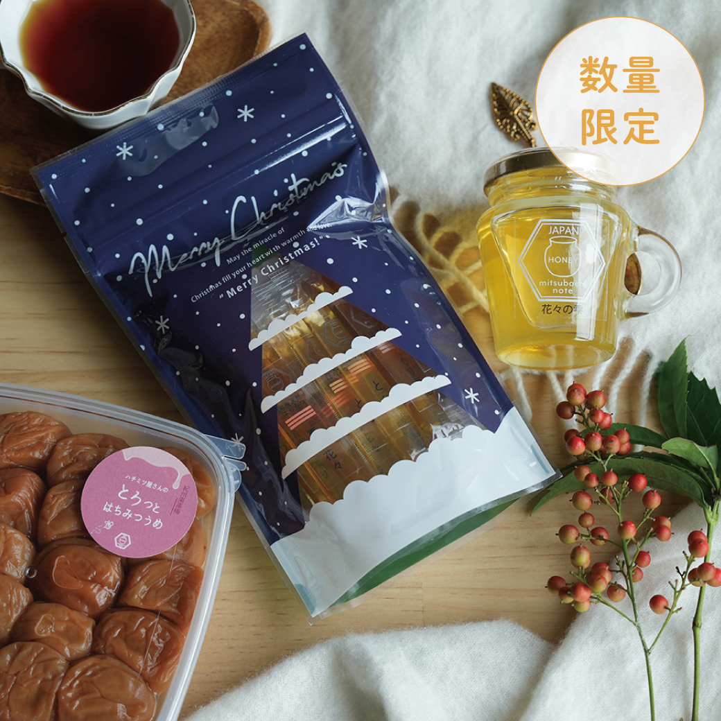 | 原材料名 | 花々の雫、5種スティックハチミツ:国産はちみつ とろっとはちみつうめ:梅(三重県産)、漬け原材料(塩(天日塩)、国産はちみつ、発酵調味料、オリゴ糖)、調味料(アミノ酸等)、酸味料、甘味料(ステビア)ビタミンB1 |
