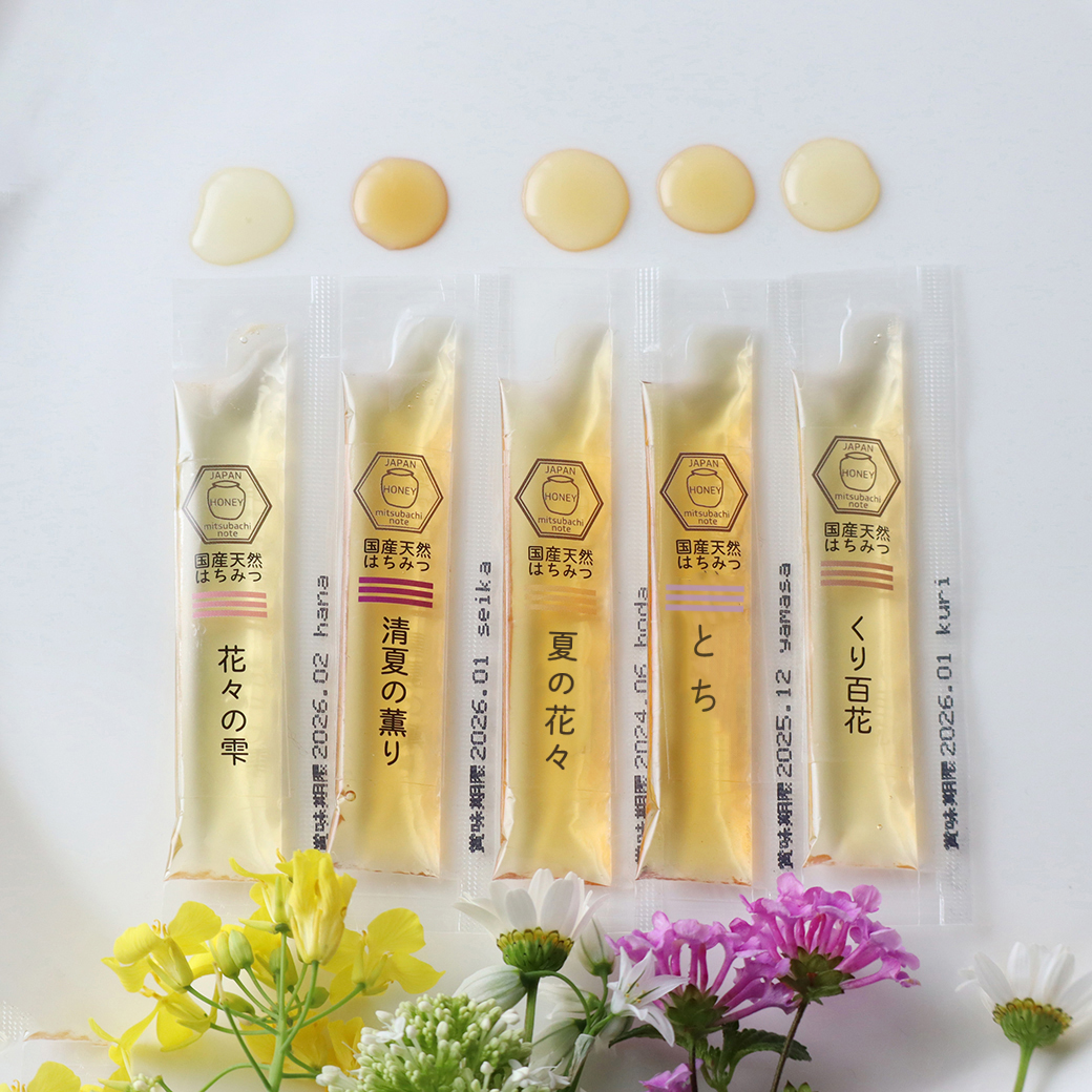 5つの味のハチミツをお詰めしましたので、気分や好みに合わせてお楽しみください。
